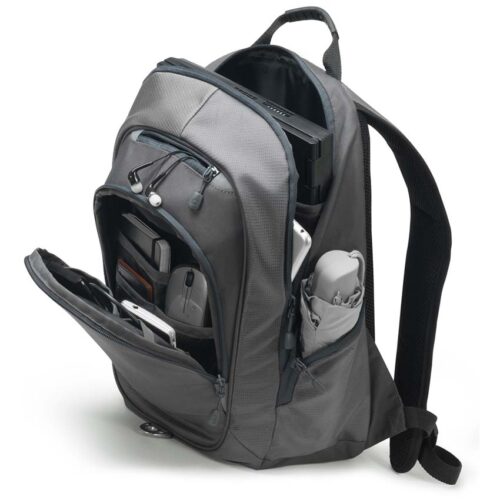 Een bevestigingsriem zorgt ervoor dat alles stevig op zijn plaats blijft zonder te verschuiven. Het hoofdvak biedt daarnaast opbergruimte voor documenten en persoonlijke spullen. In het voorvak met geïntegreerd werkstation heb je mobiele accessoires zoals je smartphone, visitekaartjes, pennen, enzovoort altijd binnen handbereik. De in lengte verstelbare, afneembare schouderriem en de handvatten zorgen voor een comfortabel draaggemak. De duurzaamheid van de ONE-familie wordt door DICOTA benadrukt.